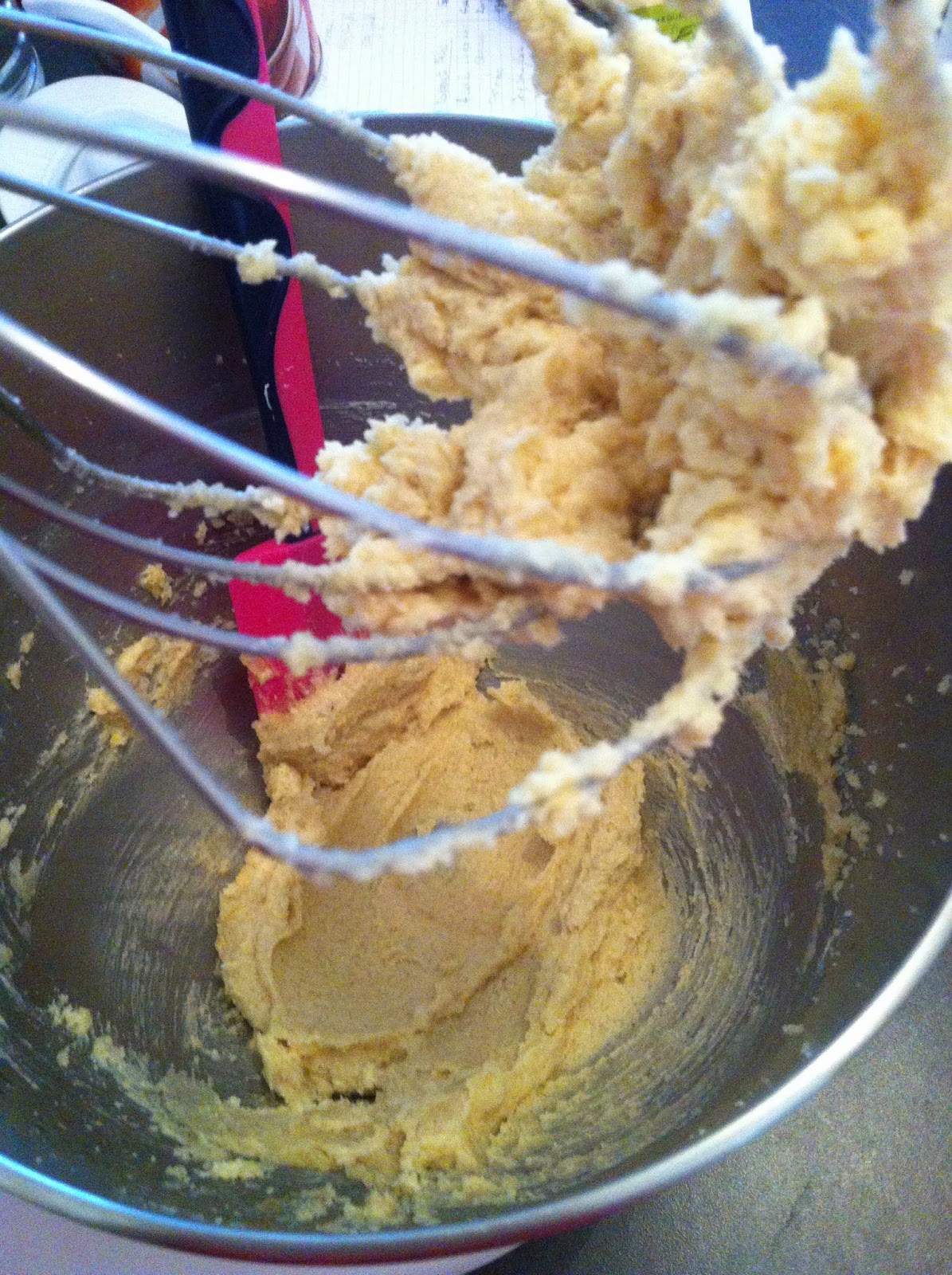 °Préparez votre gâteau, au fouet battre pendant quelques minutes le beurre avec les sucres, (pensez à racler le fond de la cuve de temps en temps) voir photo.