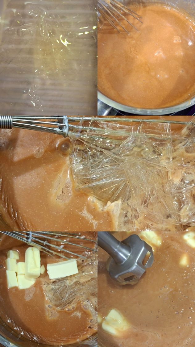 ° Remettre sur le feu pour donner un léger bouillon. Retirez du feu, ajoutez les feuilles de gélatine essorée, le beurre et la fleur de sel, mixez à l’aide d’un mixeur plongeant.