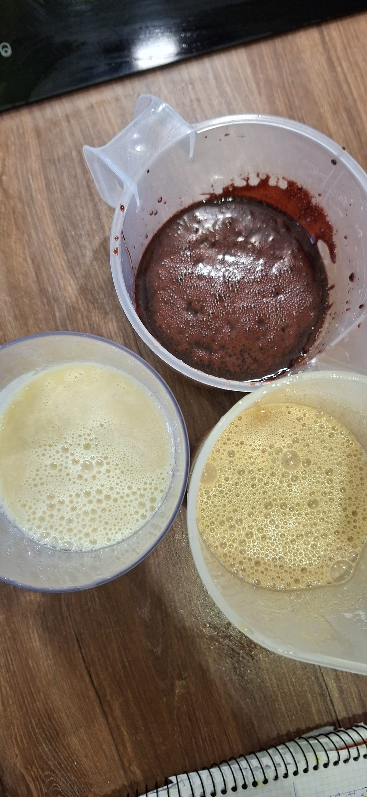 °Vous allez ensuite divisez ce liquide en trois parts. Versez 185g de ce sirop sur le chocolat dans chacun des récipients préalablement préparés. Mixez chacun d’entre eux avec un mixeur plongeant en veillant à ne pas incorporer de bulles d’air.