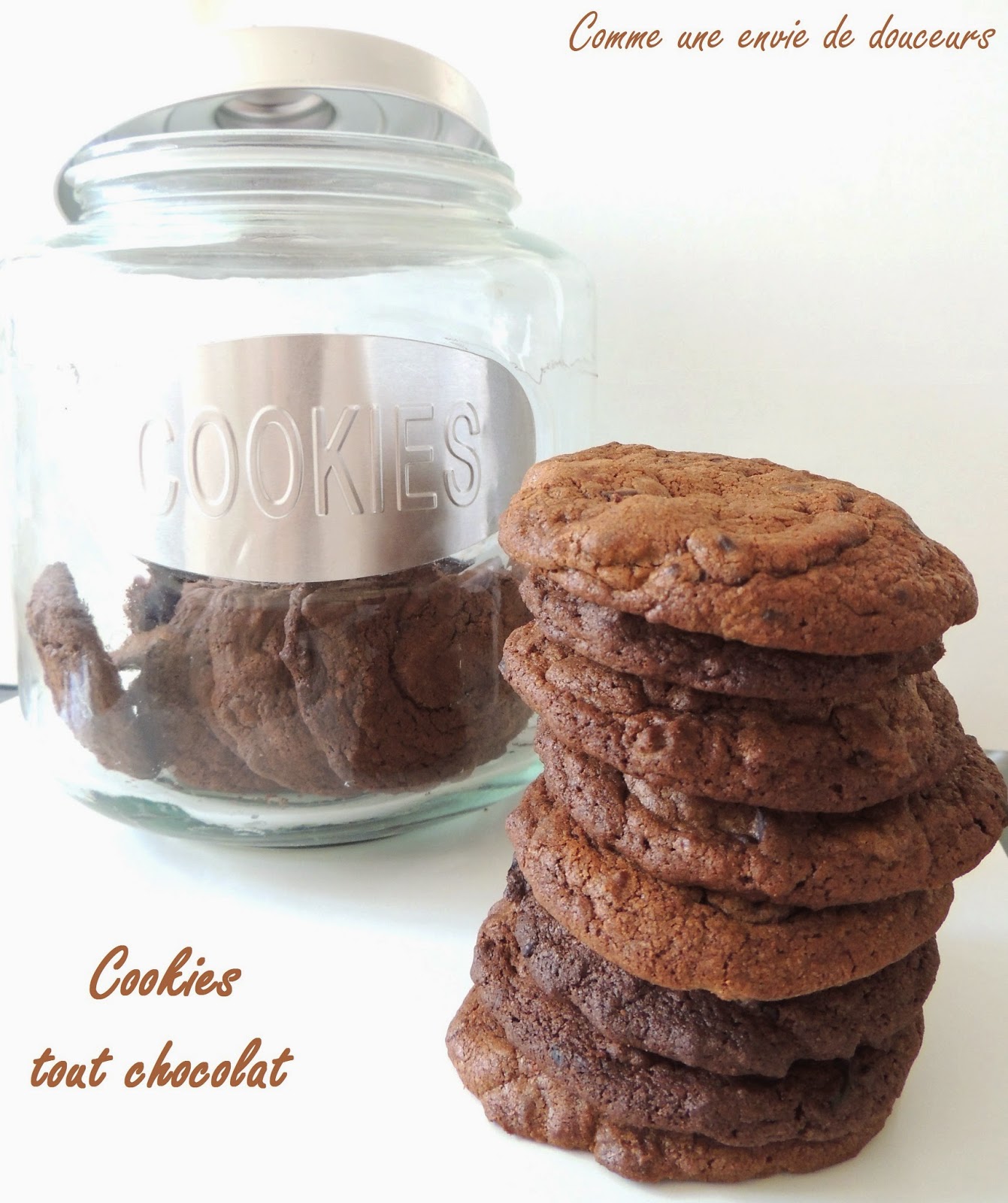 Mon mari adore les cookies, mais ce n’est pas mon biscuit préféré, même si ma recette habituelle est très bien. Je les trouve très sucrés et manquant de chocolat. Alors j’ai modifié ma recette de base pour avoir des cookies tout chocolat. J’ai décidé de n’utiliser que des cassonades au lieu du sucre en poudre, pour un résultat bien moelleux. Et je me suis lâchée sur les pépites de chocolat, j’ai même ajouté une bonne poignée de vermicelles aux chocolats. Pour un premier essai il est super réussi, mon mari et mes collègues on adoré et sont revenus piocher dans la boite!
