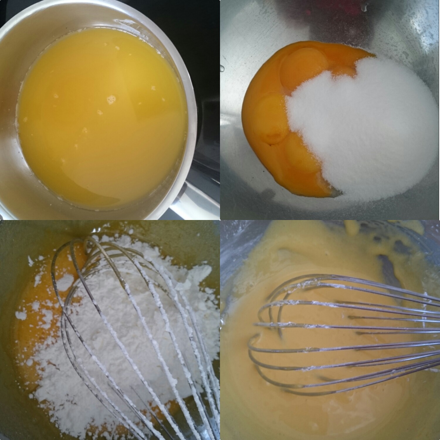 ° Add the sifted flour anc corn starch to the yolks, mix gently with half of the egg whites.