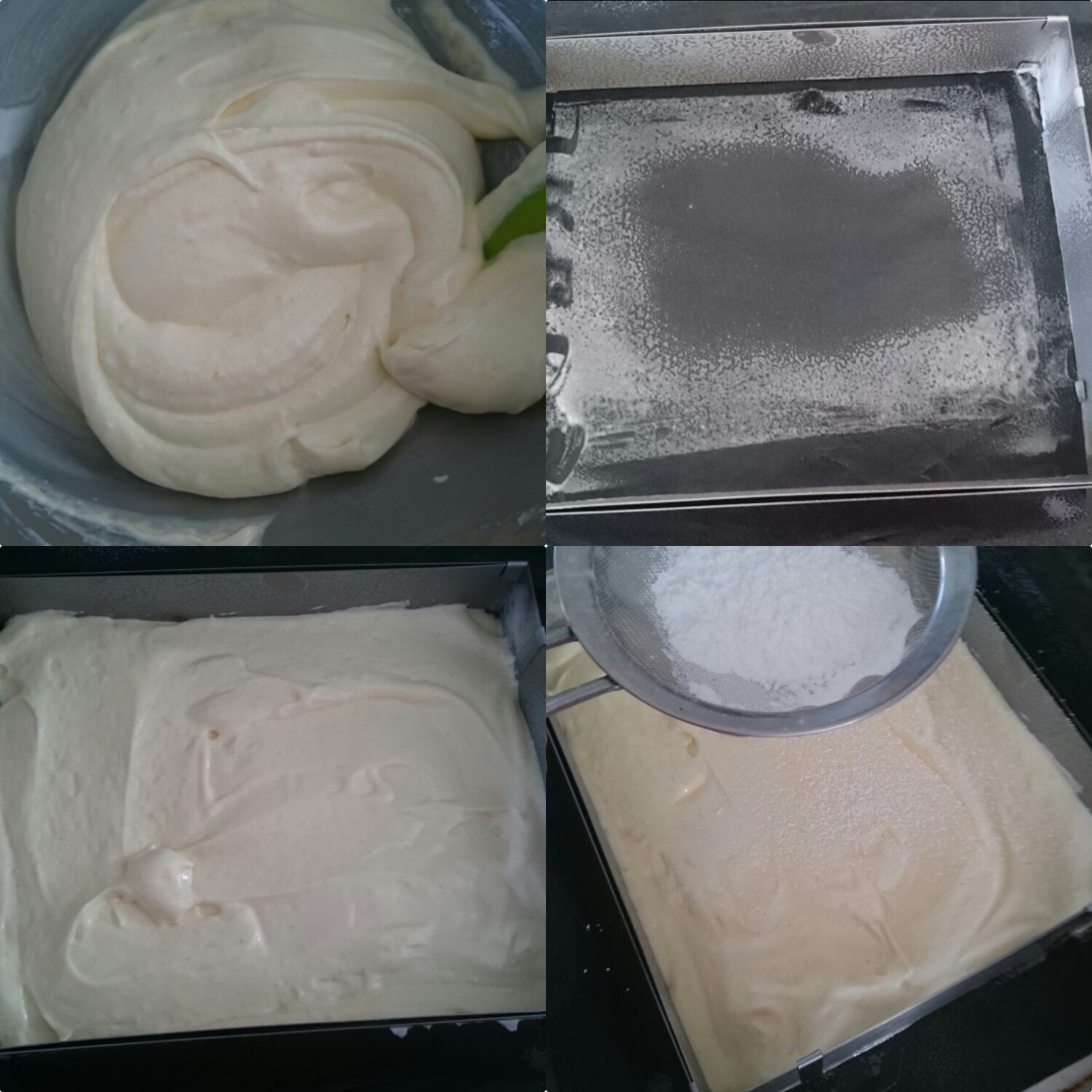 °Versez la préparation dans un cadre à pâtisserie graissé et saupoudrez de sucre glace