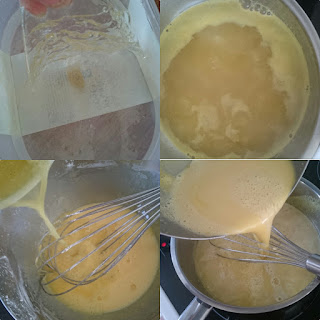 °On the other hand beat egg yolks with sugar. Add the corn starch and then pour half of the boiling juice onto it while mixing. Put the preparation back in the saucepan and cook over low heat for 3 minutes without stopping to mix with the whisk.