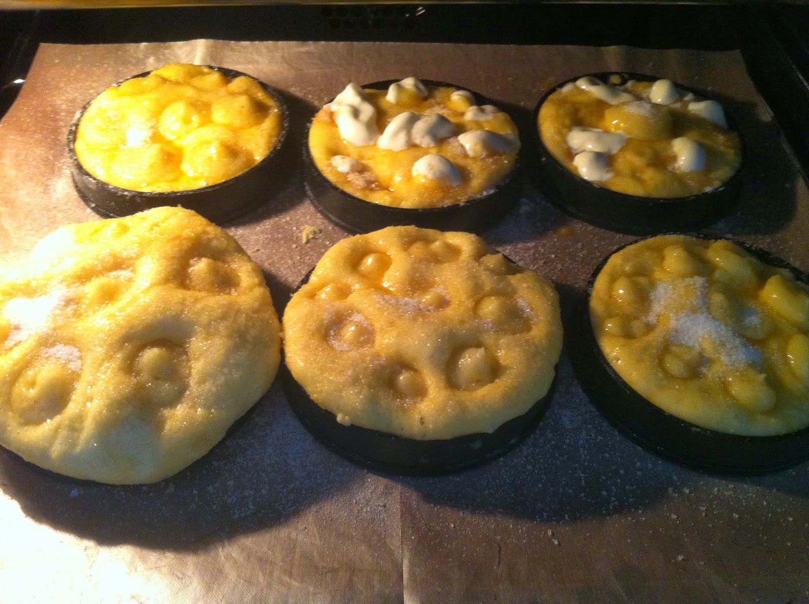 On met des morceaux de beurre, du sucre et de la crème fraiche pas légère du tout dans les trous, ou même sans faire de trous. Puis on saupoudre le tout de sucre.