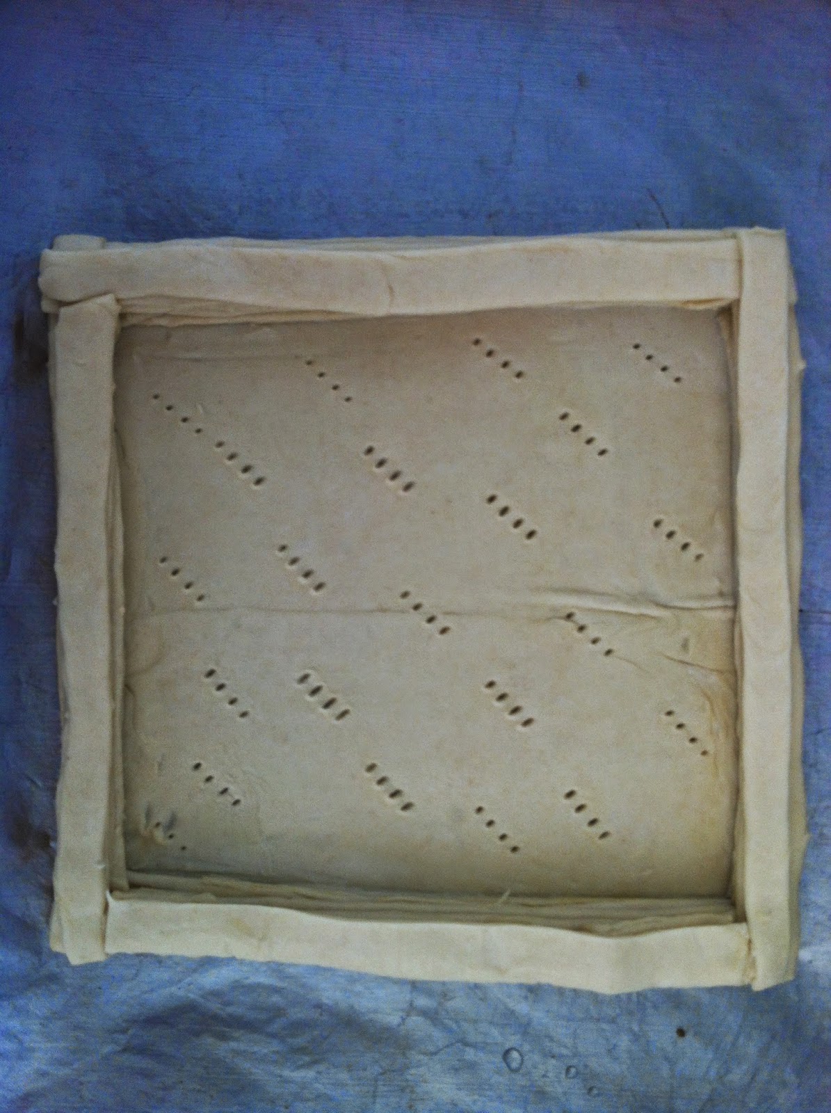 °Découper votre pâte feuilletée en carré de 25 cm de côté.
