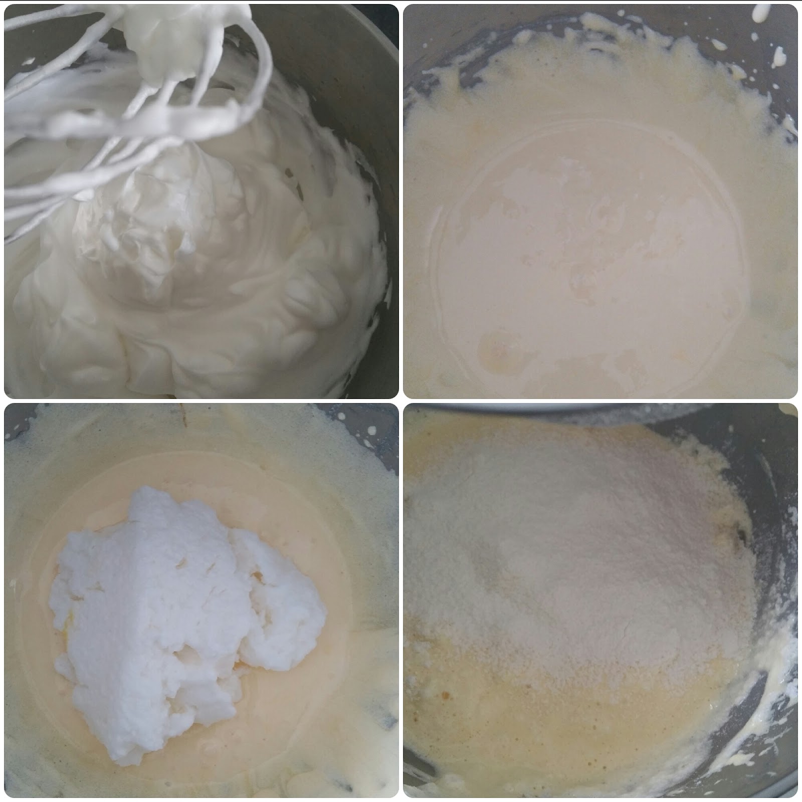 °Little by little add flour, mix delicately with a rubber spatula. Make sure there’s no flour left in the bottom of the container. Turn your container while mixing delicately to avoid air bubbles to “explode”.